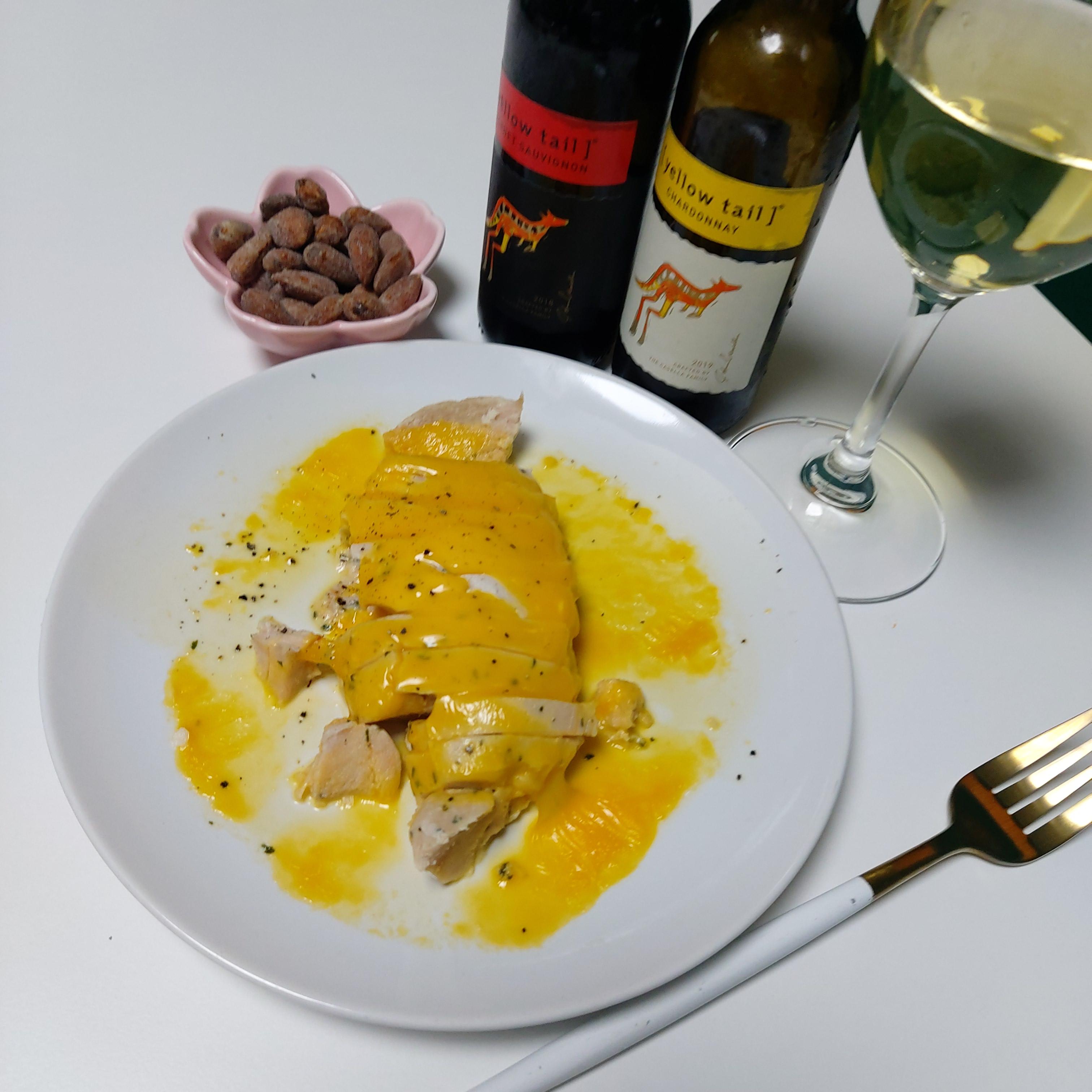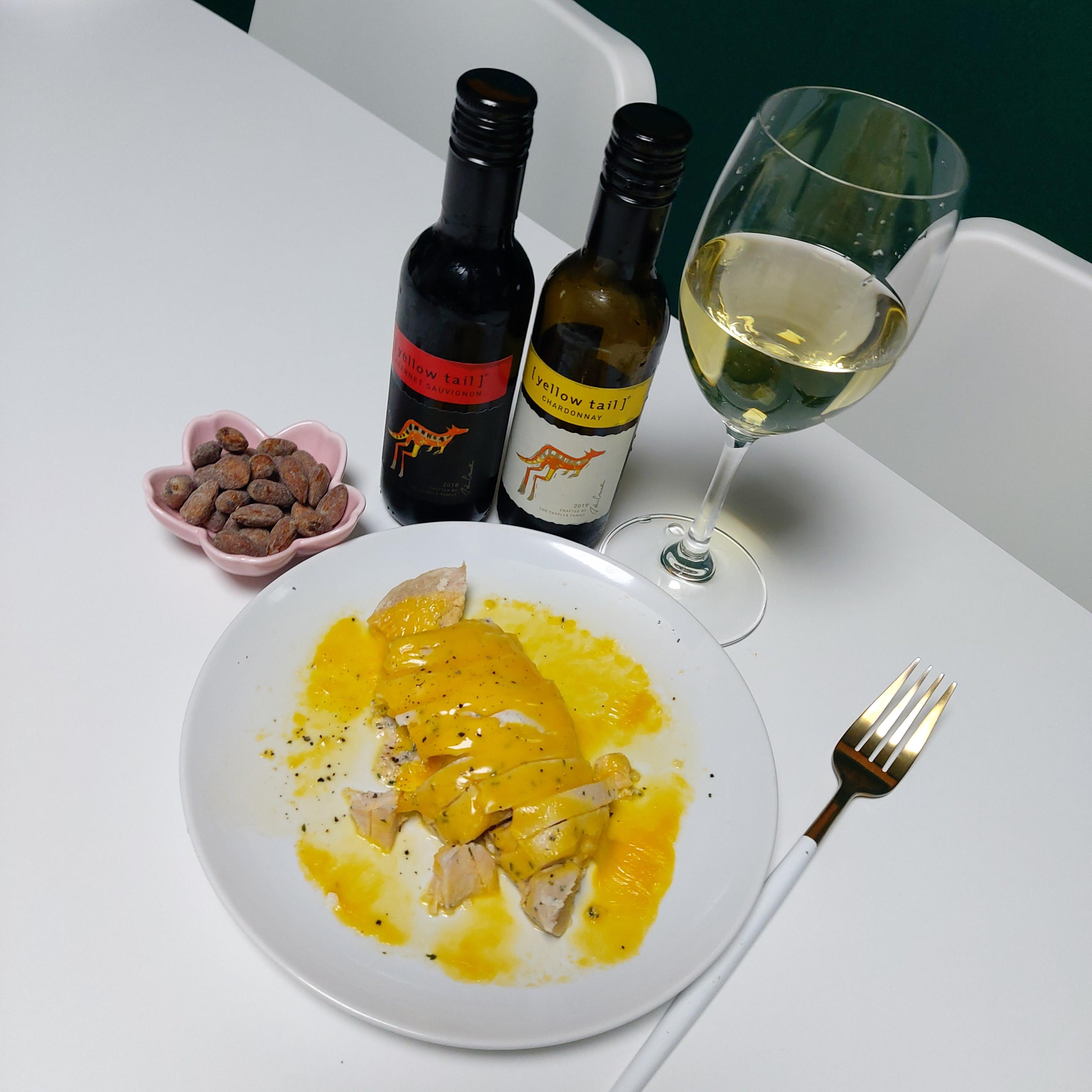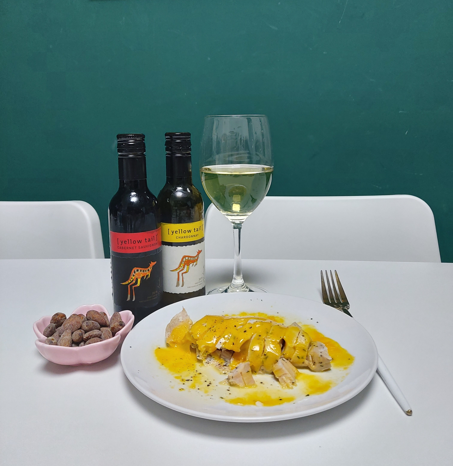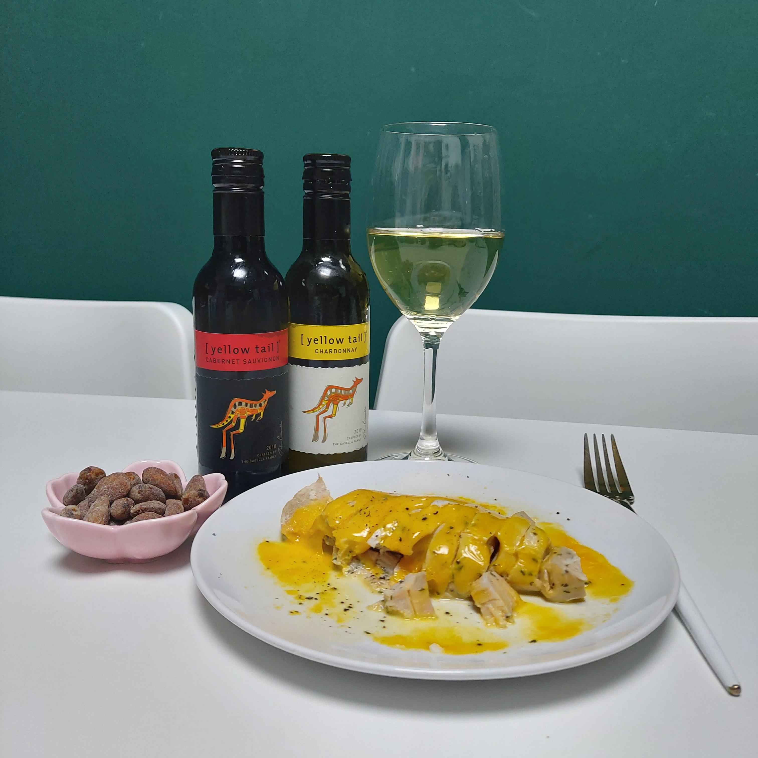 아주 잠시 동안 냉장 보관 후에 바로 마셔보았습니다. 원래 화이트 와인은 차게 마셔야 제맛이니까, 냉장고에 보관한 옐로우테일 샤도네이 와인과 함께 치즈 올린 닭가슴살, 허니버터아몬드로 가볍지만 즐거운 한끼를 즐겨보기로.