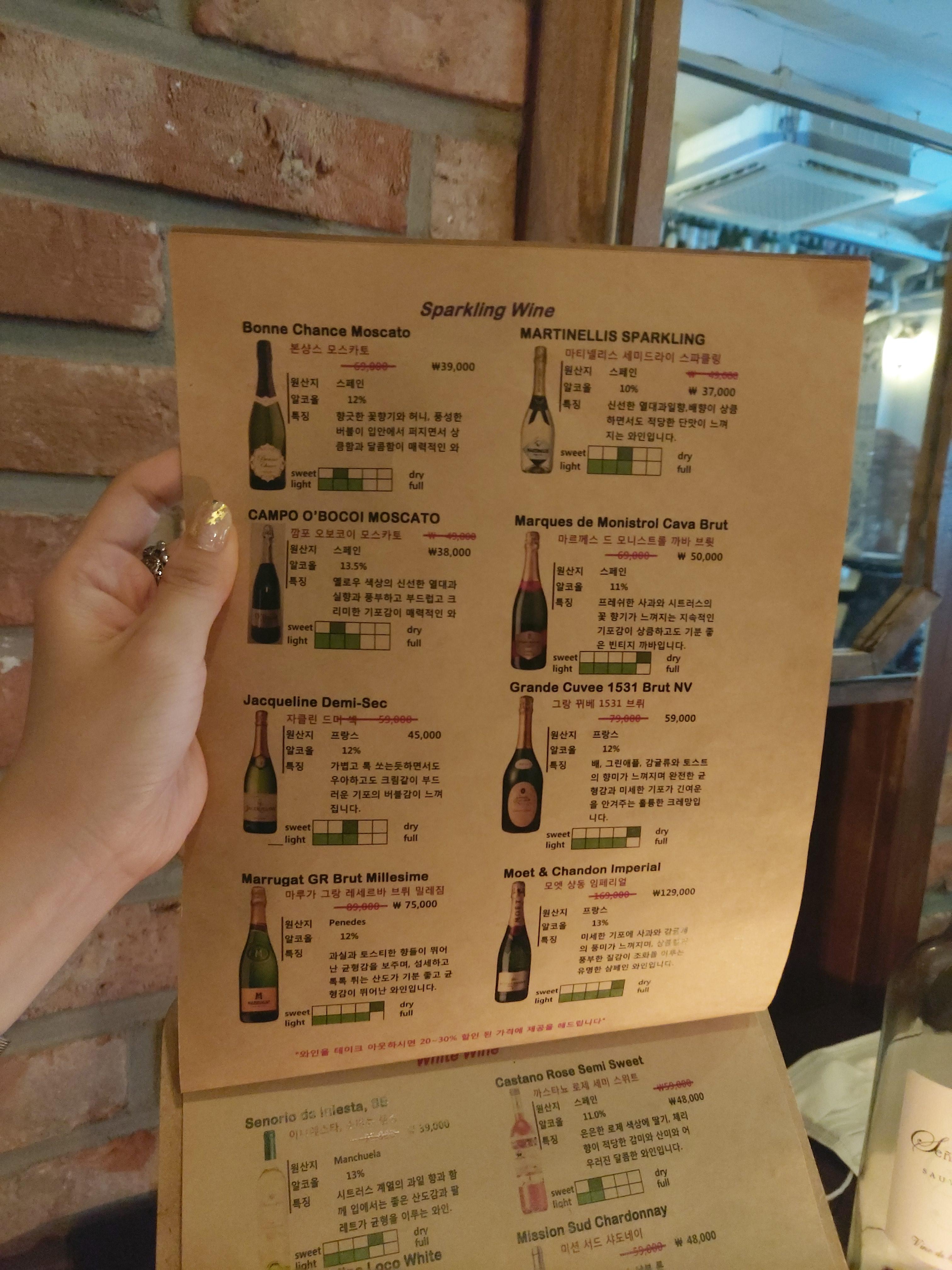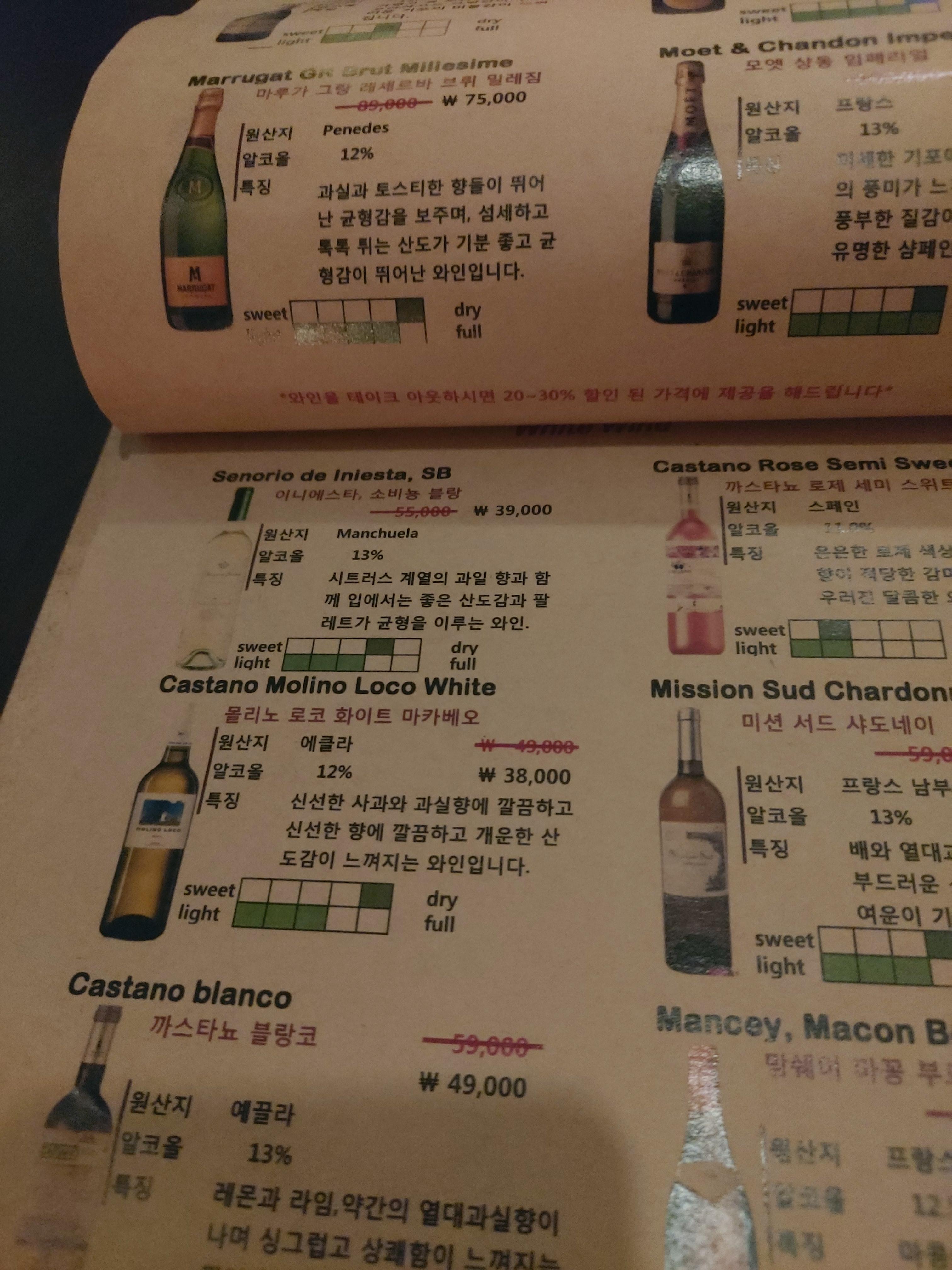 와인 리스트가 꽤나 다양하고 디테일했던 강남 와인바 미아모르. 미아모르 자체는 그리 취향저격 와인바는 아니어서, 다시 갈지는 모르겠어요. 아무튼, 이곳에서 맛본 와인은 역시나 요즘 꽂힌 드라이 화이트 와인이예요. 세뇨리오 드 이니에스타를 선택했습니다. 와인에 대한 디테일한 설명이 초이스에 많은 도움이 되었는데요, 시트러스 계열의 과일 향과 함께 산도감이 좋고 팔레트가 균형을 이루는 와인이라기에 딱 제가 좋아하는 느낌일 것 같아 초이스. 무엇보다도, 병 디자인이 상큼하니 예쁘기도 했구요? (비쥬얼을 중시하는 편)