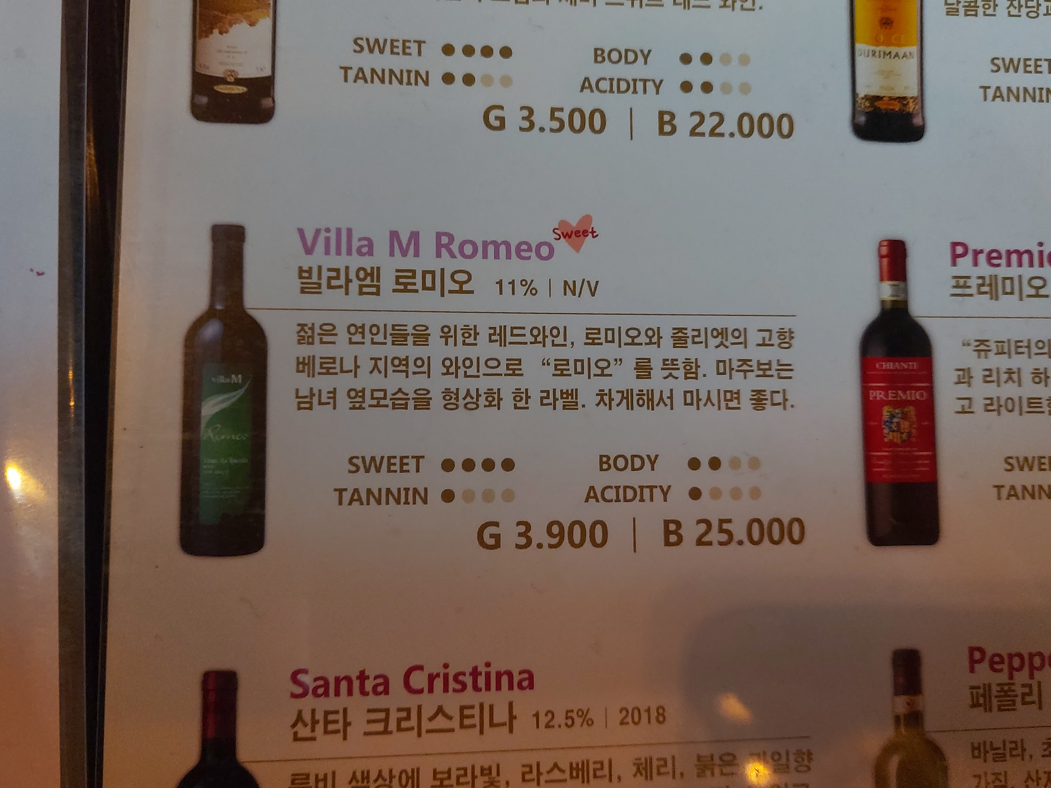 연인들이 로맨틱하게 분위기 잡을 때 자주 먹곤 하는 와인! 하지만 연인이 와인을 그다지 즐기지 않는다면...?ㅎㅎ 좀더 로맨틱한 이야기가 담긴 달콤한 와인을 마셔보는 것도 좋은 선택이 될 거예요. 와인바에서 가볍게 한 잔 즐겨 본, 빌라 엠 줄리아는 나름 로맨틱하고 괜찮은 이탈리아산 스위트 와인이었습니다.