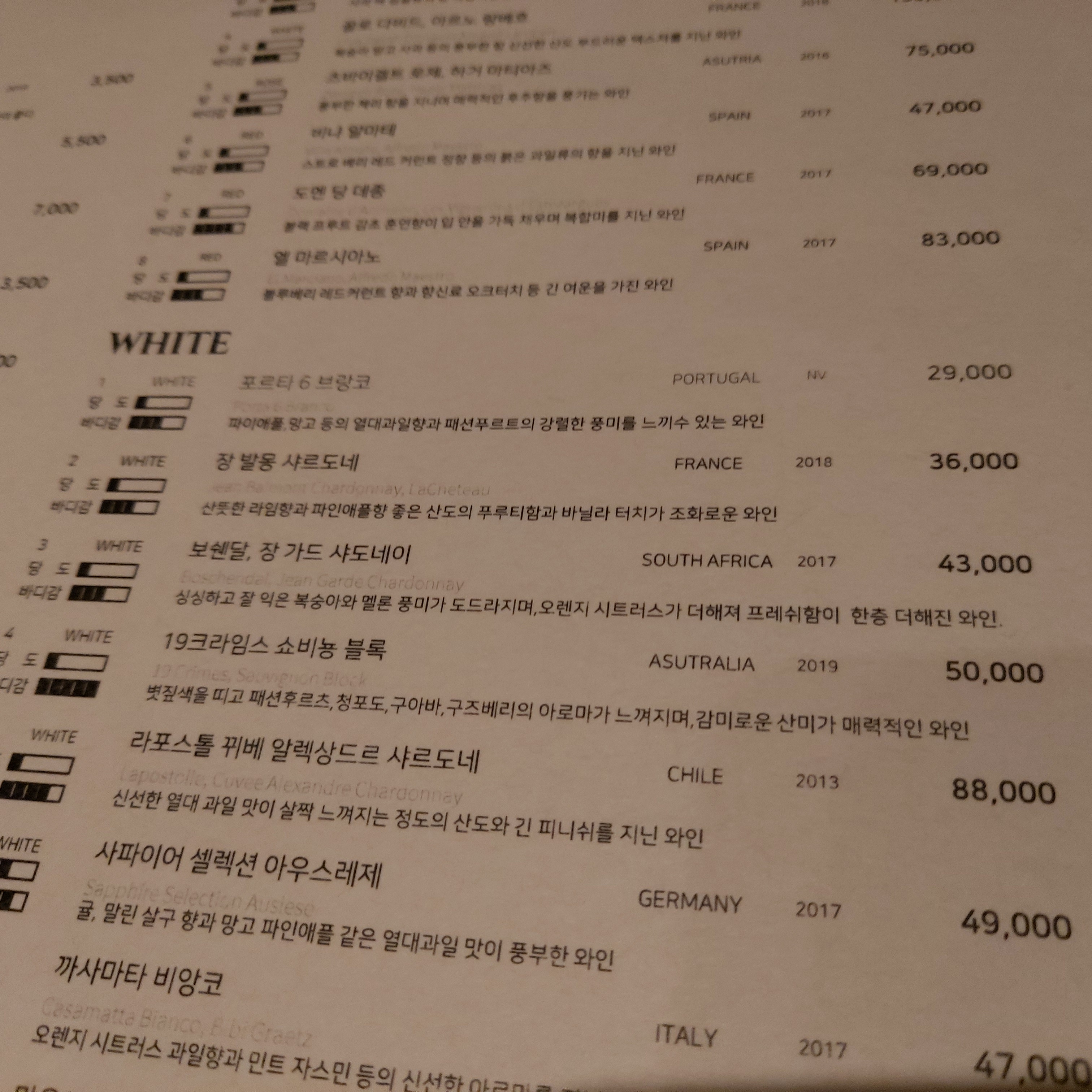 정말 괜찮은 와인바라서 또다시 재방문한 신논현 와인바 '까치양조장' 에서 맛본 화이트 와인입니다. 설명처럼 달지 않은 드라이한 와인으로, 향이 좋으면서도 타닌감이나 산도가 확 튀지 않으면서 둥글게 둥글게- 무난하게 즐기기 좋은 화이트 와인이었어요.