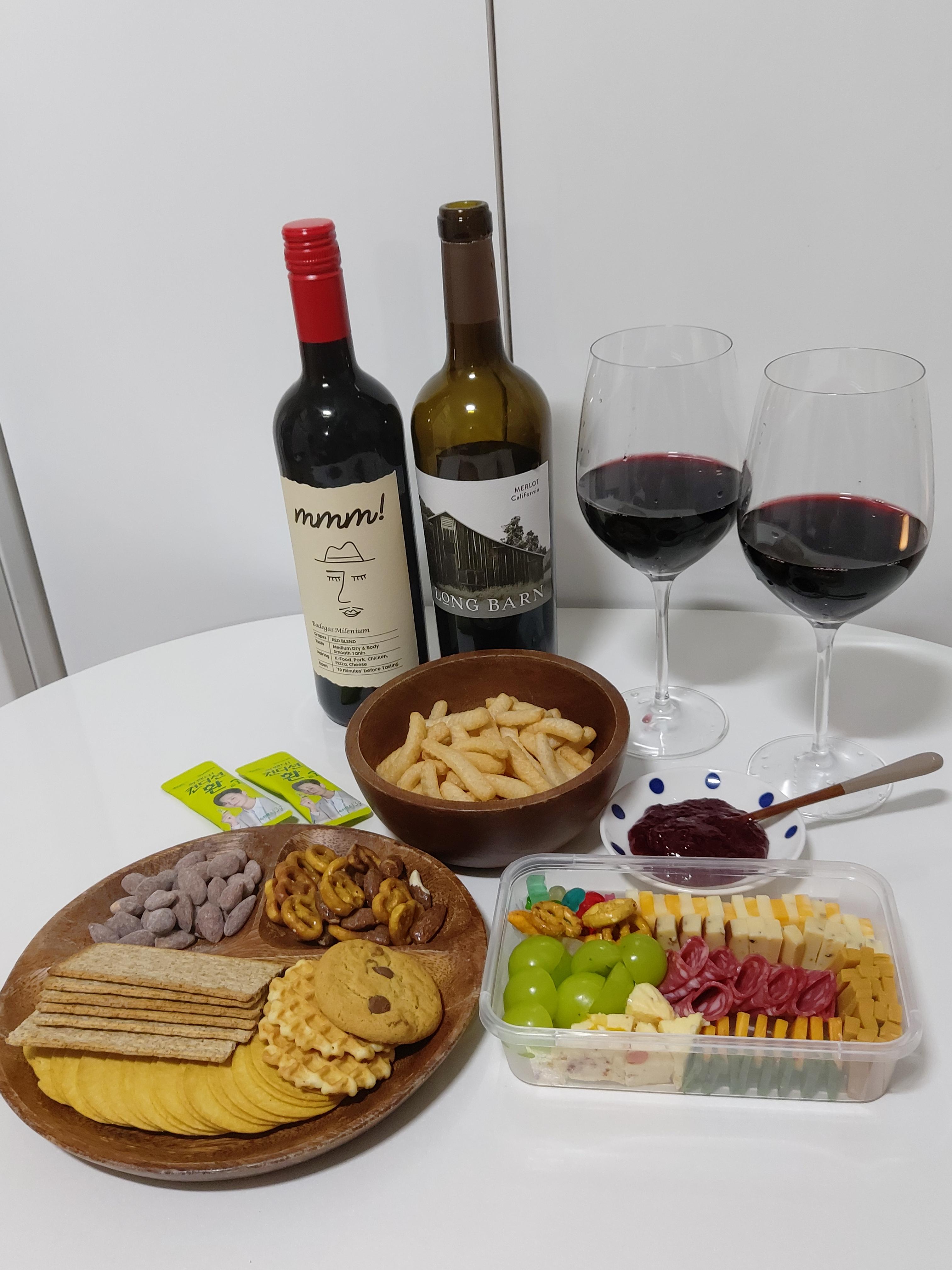 최상급 메를로는 실키한 탄닌과 딸기, 라즈베리, 블랙 커런트, 블랙 체리, 무화과, 자두의 풍미를 지닙니다. 와인의 맛 자체가 강렬하거나 과하게 드라이하지 않아서 와인 그 자체로 즐기기에도 좋은 와인이지만, 육류부터 디저트까지 폭넓게 잘 어울리니 와인으로만 즐기기에 아까워 모듬 치즈 플레이트와 풍성한 디저트를 준비했지요. 계피와 초콜릿 향이 난다고도 하는데, 설명된 내용보다 좀더 달달하다는 느낌을 받았어요. 미국 와인 특유의 달달한 베리 향과 함께 탄닌감이 살짝 느껴져서 묵직하지는 않고, 간단히 기분내며 마시기 좋은 레드와인이었어요. 멜롯 품종이 아무래도 까베르네 쇼비뇽보다는 타닌감이 적어서, 레드와인 특유의 타닌감이 익숙하지 않은 분들도 쉽게 마시기 좋은 와인이라는 생각이 듭니다. 집에서 스테이크나 고기 구워서 홈파티할 때, 혹은 고깃집에서 콜키지하기에도 괜찮은 와인인 것 같아요. 홈플러스 2만원대 와인으로 나쁘지 않았습니다.