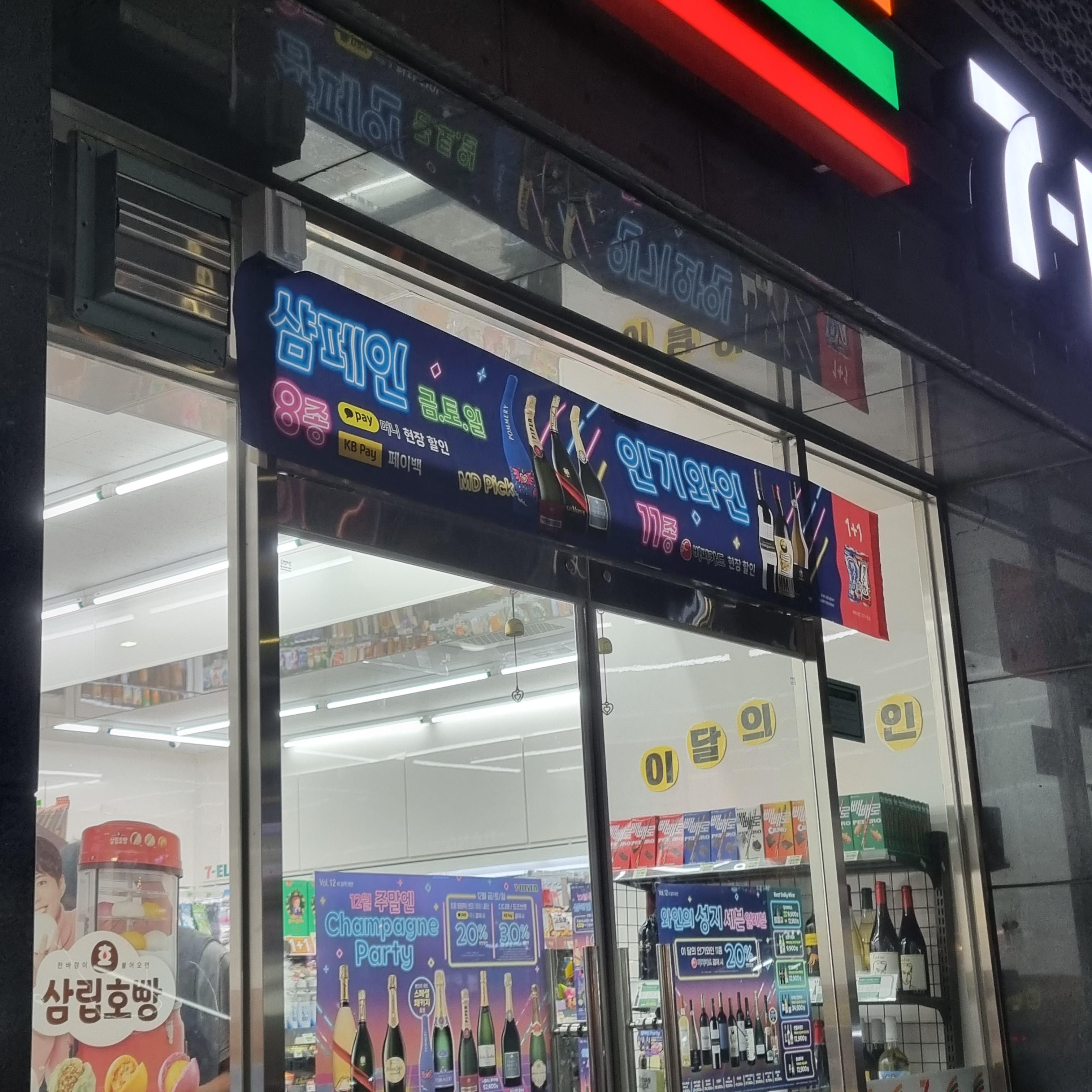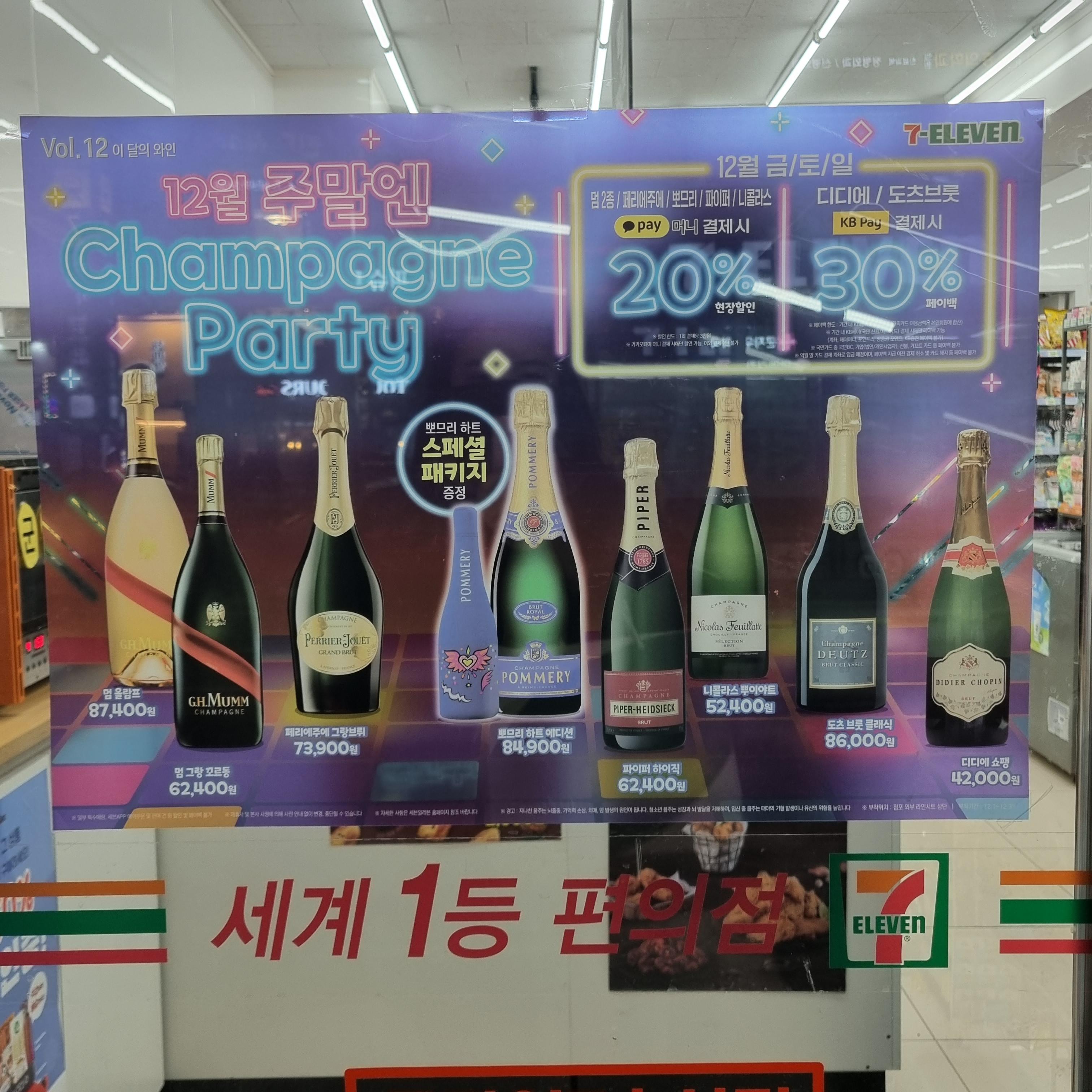 연말연초엔 역시 와인 가격 할인 행사를 많이 하는 세븐일레븐. 금, 토, 일요일엔 샴페인 8종을 카카오페이 현장 할인이나 KB페이 페이백으로 구매할 수 있고, 인기 와인 11종을 BC카드 현장 할인받아 구매할 수 있어요.